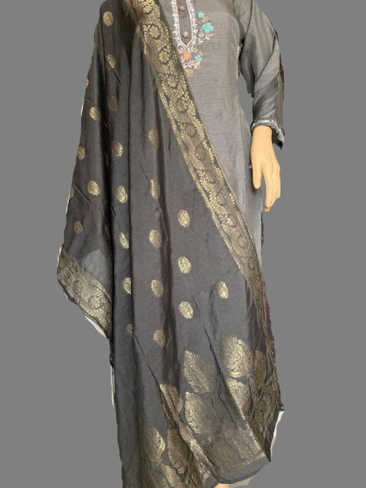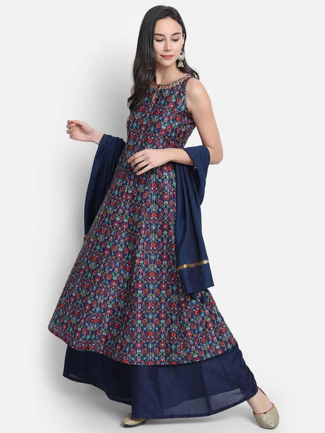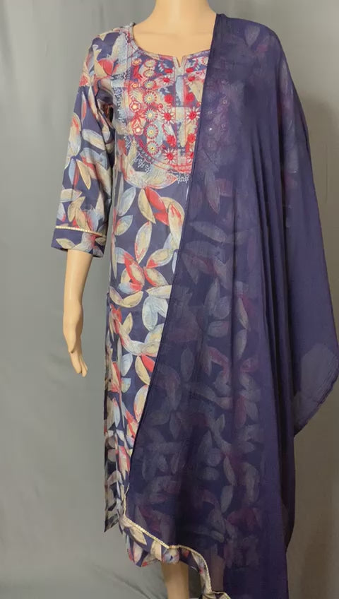 Blue Poly Muslin Embroidered Kurta with Palazzo and Dupatta
