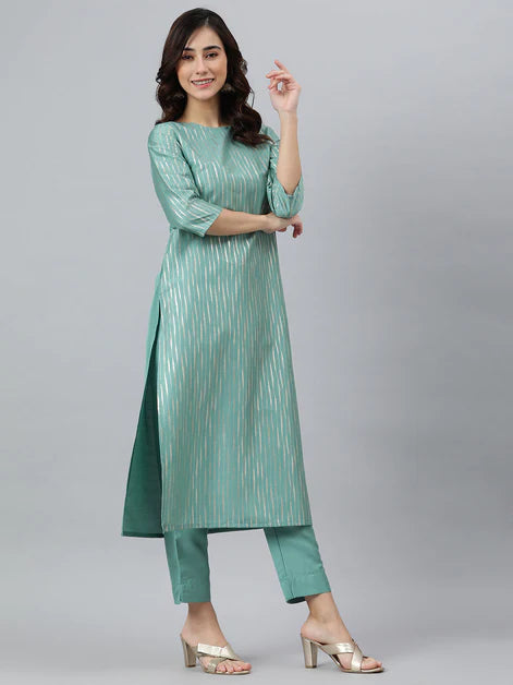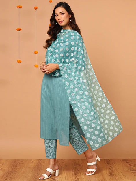 Turquoise Cotton Striped Kurta with Pant and Dupatta