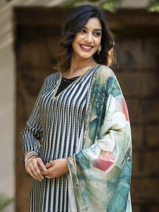 Turquoise Cotton Striped Kurta with Pant and Dupatta - Turquoise