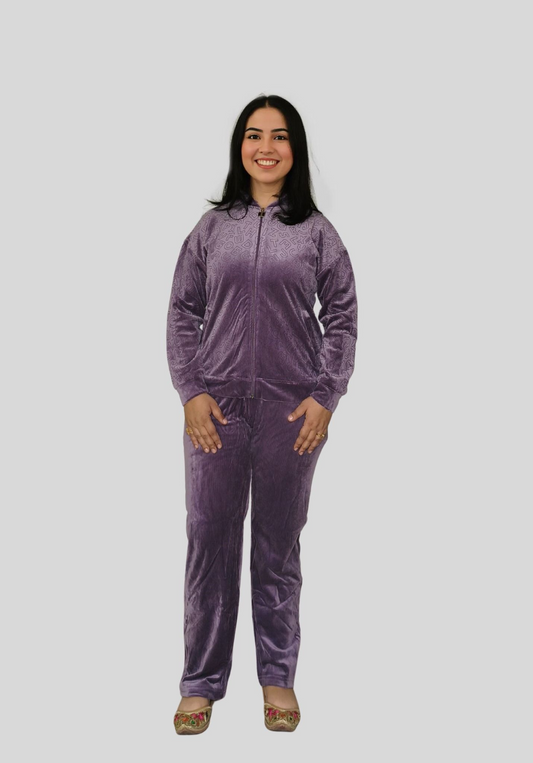 Velvet Zipper Top & Matching Pants Set with Subtle Self-Print