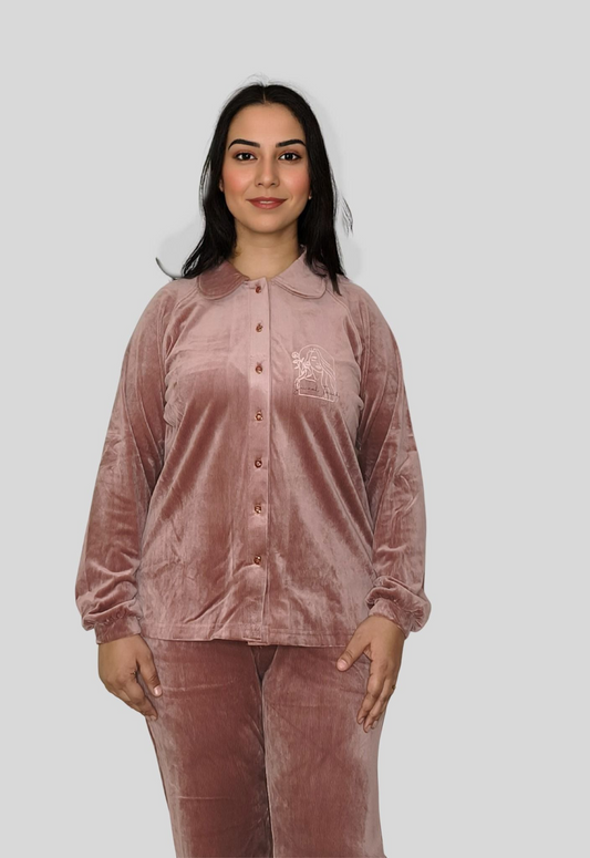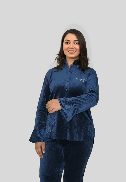 Velvet Collared Shirt & Flared Pants Set with Subtle Print