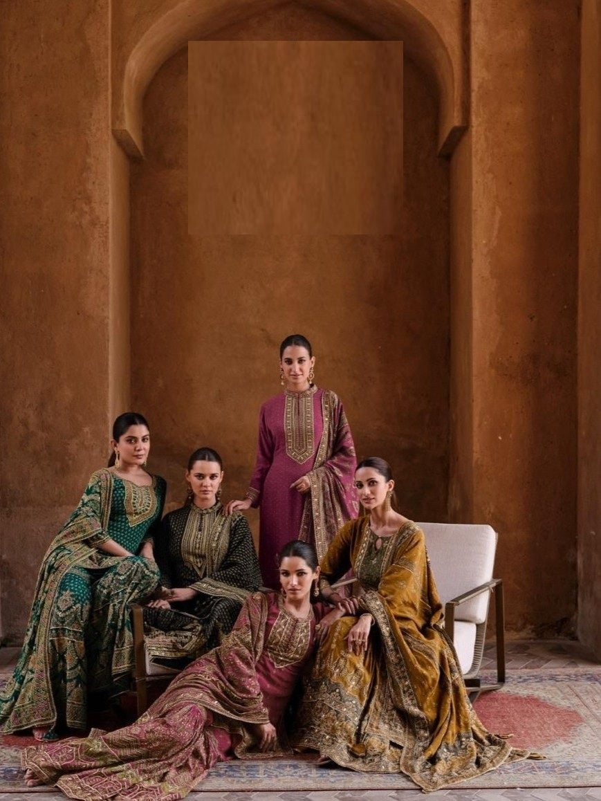 BOTTOM: Premium crepe silk with elegant print and hand mundi work sharara with inner lining (free size stitched)