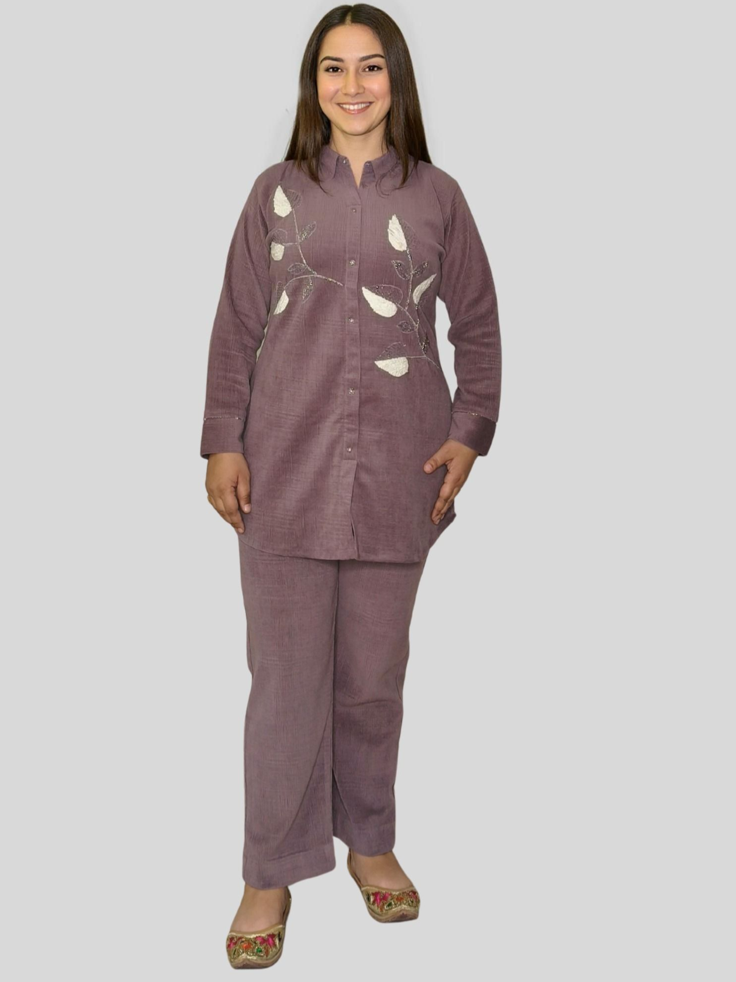 TOP: Shirt-style in solid colored imported corduroy velvet with elegant embroidery on daman and fancy buttons