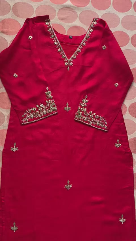 Top: Tussar silk with beautiful embroidery work on neckline and sleeves. Has cotton inner lining.